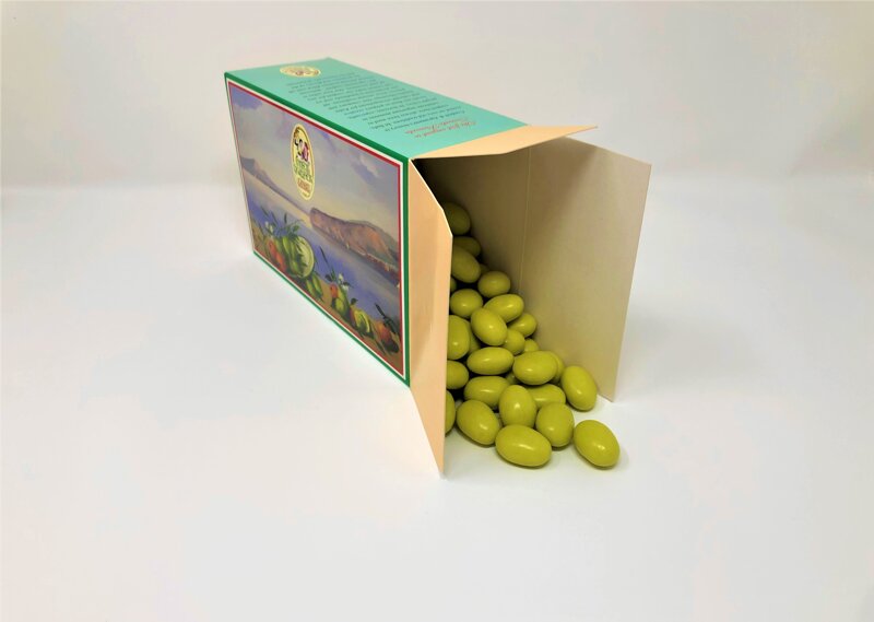 Mandorla tostata avvolta in una deliziosa crema bianca al Limone e Cedro, racchiusa in un sottile strato di zucchero.